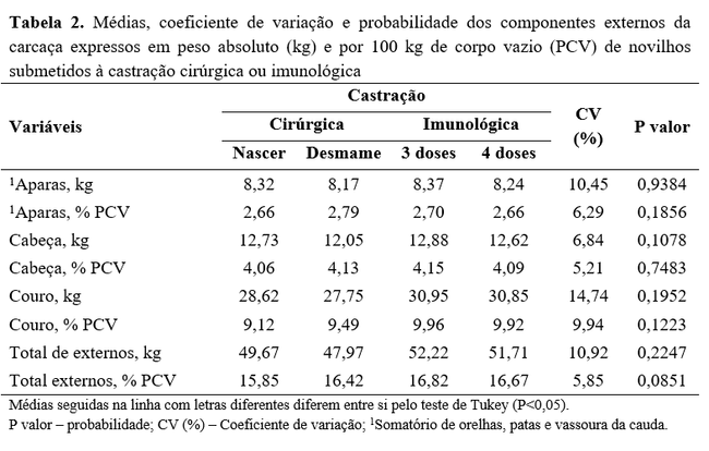 A ausência de diferenças estatísticas nas variáveis descritas nas Tabelas 1 e 2 (P>0,05) são benéficas no sentido de validar a tecnologia da imunocastração, demonstrando que a mesma é igualmente eficiente à castração cirúrgica. Logo, sob este prisma a imunocastração é mais uma alternativa de manejo que pode ser adotada pelos produtores, reduzindo todos os inconvenientes da castração cirúrgica e melhorando os aspectos de bem-estar animal. A castração cirúrgica, juntamente com a descorna, são os procedimentos mais traumáticos pelos quais os bovinos criados em ambiente pastoril são submetidos ao longo da vida produtiva(13).