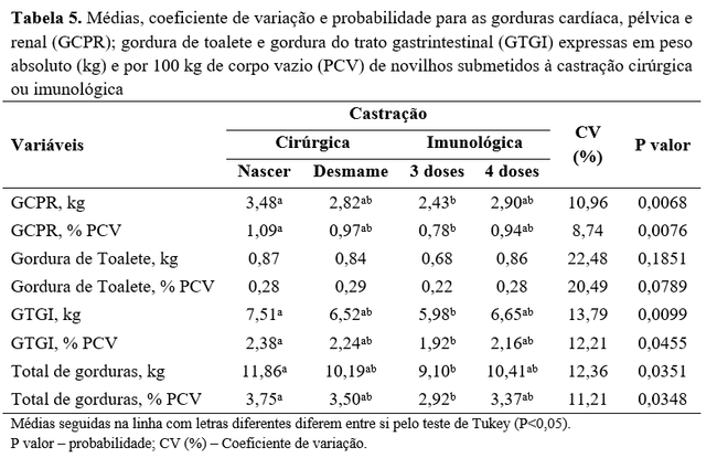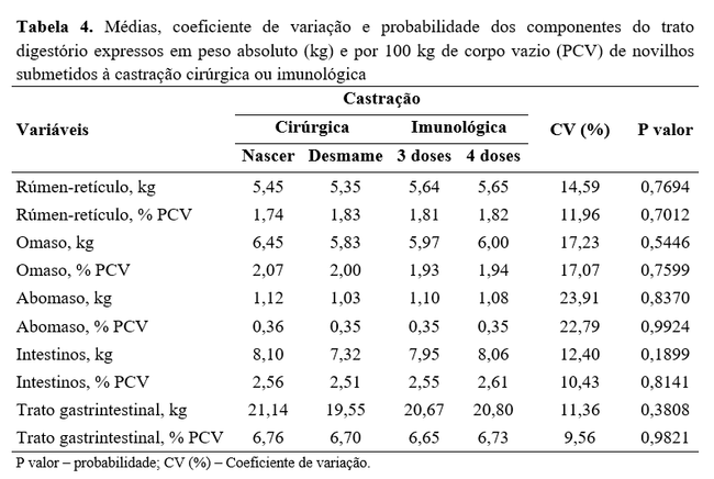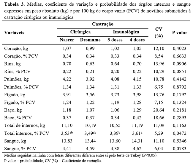 Com relação ao somatório dos órgãos internos, verificamos valores similares em peso absoluto, com valor médio de 10,76 kg (Tabela 3). Todavia, quando estes foram expressos por 100 kg PCV obteve-se diferença significativa entre os dois protocolos de castração imunológica (P<0,05). Novilhos que receberam quatro aplicações da vacina apresentaram maior conjunto destes órgãos que aqueles que receberam três aplicações (3,61 vs. 3,39 kg por 100 kg PCV), enquanto os submetidos à castração cirúrgica foram similares aos demais, independentemente da idade de realização do procedimento. Estes resultados são contraditórios, porque a expectativa era de que se algum tratamento fosse beneficiado pela metodologia de castração seria o de três aplicações, em função do maior período, em que poderia haver ação de testosterona, como relatado anteriormente.