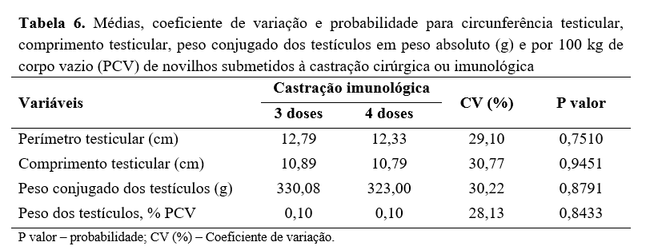Esta semelhança já era esperada, uma vez que na ocasião do abate os novilhos dos dois grupos já se caracterizavam como castrados imunologicamente, o que suprime a produção hormonal de FSH, LH e testosterona. Esta supressão hormonal impede que o desenvolvimento testicular de bovinos imunocastrados seja semelhante a não castrados, com marcante redução de perímetro e peso dos testículos(11). Ao analisarmos do ponto de vista prático e econômico, este resultado é bastante relevante, pois estes indicadores juntamente com as demais variáveis discutidas neste trabalho nos permitem recomendar o protocolo com três aplicações da vacina Bopriva® para novilhos imunocastrados desde idade pré-púbere. Isto porque implica em redução de manejo e principalmente de custos.