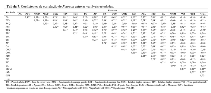 Os coeficientes de correlação dos componentes periféricos com o PCV foram positivos, aparas (r=0,77; P>0,0001); cabeça (r=0,84; P>0,0001); couro (r=0,72; P>0,0001) e o somatório destes (r=0,83; P>0,0001). Estes resultados corroboram a afirmação anterior acerca da similaridade entre tratamentos para estas características.