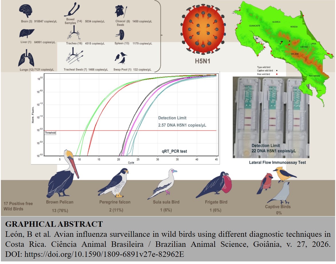 A vigilância do vírus da influenza aviária (VIA) é essencial para detectar precocemente surtos em aves silvestres. O presente estudo comparou a eficácia do teste rápido imunocromatográfico (TRI) com a PCR em tempo real (qRT-PCR). O TRI demonstrou maior sensibilidade que o teste de imunodifusão em gel de ágar (TIGA), detectando antígenos até a diluição 1:512, contra 1:16 do TIGA. Esses resultados foram confirmados por qRT-PCR, com valor médio de Ct de 34,5 (22 cópias de DNA viral/µL), e limite de detecção de 2,57 cópias/µL. Um total de 61 aves silvestres foram reportadas ao Serviço Nacional de Saúde Animal (SENASA) da Costa Rica entre janeiro e dezembro de 2023. Destas, 47 (77,04%) apresentaram sinais clínicos compatíveis com influenza aviária, enquanto 14 (22,96%) foram encontradas mortas. Foram identificadas treze ordens taxonômicas e 22 espécies de aves, sendo que 32,20 % das amostras pertenciam à ordem Pelecaniformes. Utilizando a técnica de qRT-PCR, 17 das 61 aves (27,86 %) testaram positivo para o vírus da influenza A (H5N1). Entre os casos positivos, 76,47 % eram Pelecanus occidentalis, 11,77 % Falco peregrinus, 5,88 % atobás-de-pé-vermelho (Sula sula) e 5,88 % fragatas-grandes (Fregata minor). Das 61 aves silvestres, 14 (7 positivas e 7 negativas) foram testadas tanto por RIT quanto por qRT-PCR, mostrando 100% de concordância entre os dois métodos. A análise geoespacial indicou maior concentração de casos na costa do Pacífico. A variação na carga viral entre diferentes tecidos reforça o risco de falsos negativos e a necessidade de otimização da coleta. Nenhuma das 200 amostras de suabes cloacais de aves em centros de resgate testou positivo por RIT. Os achados destacam a importância de métodos diagnósticos combinados e de vigilância contínua para o controle eficaz da influenza aviária na Costa Rica.