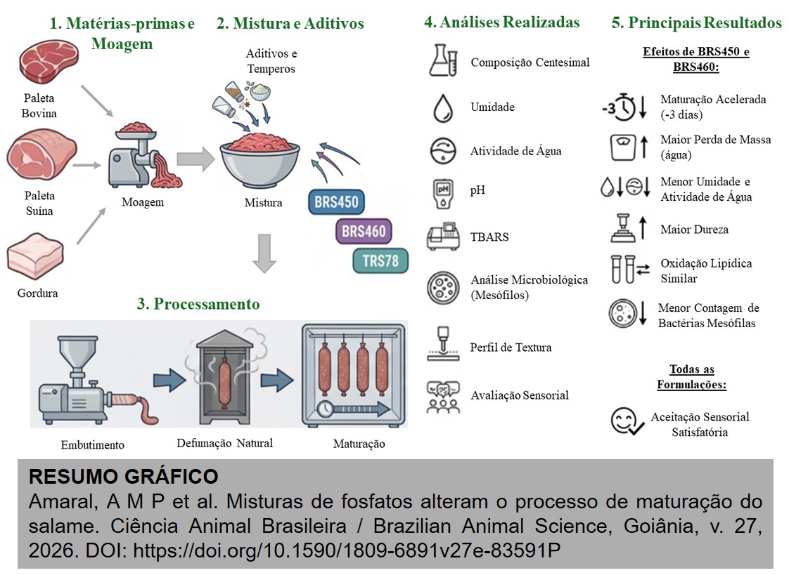 Este estudo avaliou os efeitos de três misturas de fosfatos no processo de maturação de linguiças fermentadas secas (salame) em comparação com uma amostra controle sem fosfato, por meio da avaliação de características físico-químicas, microbiológicas e sensoriais. As misturas de fosfatos alcalinos (BRS450 e BRS460) foram mais eficazes em acelerar a maturação, em três dias, em relação à amostra controle, observado pela maior perda de peso e menores teores de umidade e atividade de água; entretanto, a redução do pH ocorreu de forma mais lenta. Essas formulações também resultaram em uma linguiça com maior dureza devido ao menor teor final de umidade, níveis semelhantes de oxidação lipídica e menores contagens de bactérias mesófilas. As amostras apresentaram aceitação sensorial satisfatória (escore > 7) para cor, aparência, aroma, sabor e textura. De modo geral, os resultados indicam que as misturas de fosfatos representam uma estratégia tecnológica eficaz para acelerar a maturação do salame sem comprometer a qualidade do produto, contribuindo para a redução do tempo de processamento e potenciais benefícios econômicos.